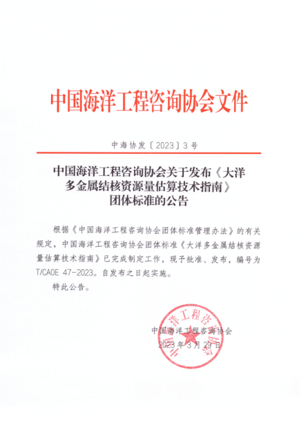 本团体标准在现行的多金属结核资源量估算方法的基础上,以地质取样数据为基准数据,结合近底光学探测和声学探测数据的应用,提高海底多金属结核资源量估算的地质可靠程度,是对《大洋多金属结核资源勘查规范》(GB/T 35571-2017)和《大洋多金属结核矿产勘查规程》(GB/T 17229-1998)系列标准的补充和拓展。本团体标准编制的目的是为了规范大洋多金属结核资源量估算的方法,为下一步制定储量计算标准,开展技术经济可行性研究奠定了基础。(供稿单位:北京先驱高技术开发有限责任公司)