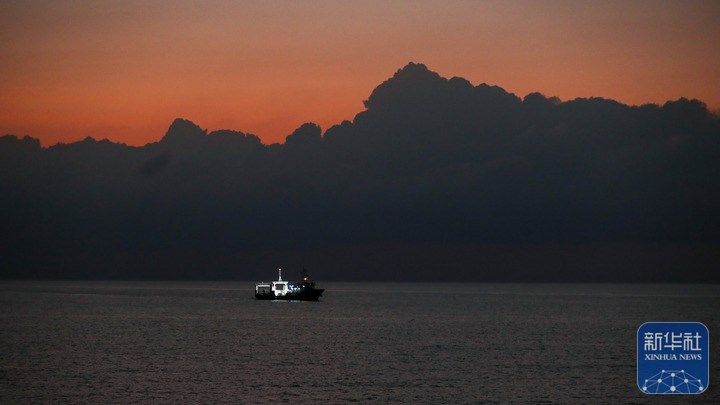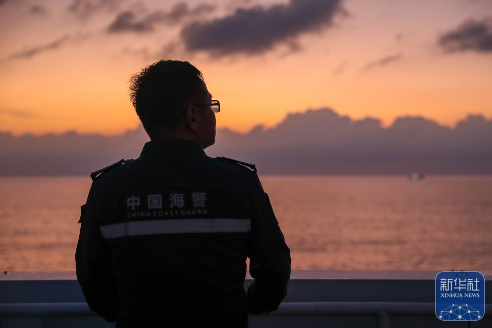 ↑3月25日,在黄岩岛附近海域,一名海警执法员在高栏舰上观赏晚霞。
