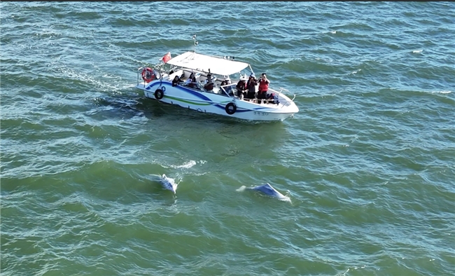 三娘湾拥有全球罕见的中华白海豚稳定种群。其标志性的粉白色,源于成年后皮肤色素减退与皮下血管透色的自然现象,如同大海馈赠的成长勋章。这片海域之所以成为中华白海豚的理想家园,既得益于天然避风港的地理优势和优质水质孕育的丰富鱼群,更离不开当地“让中华白海豚与大工业同在”的创新保护实践。