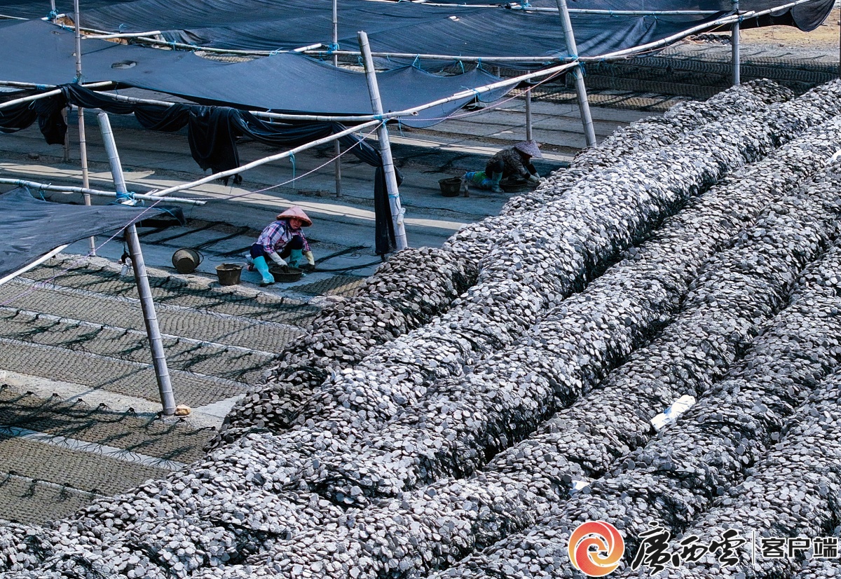 4月20日,在钦州市龙门港连片万亩大蚝养殖基地,村民在制作蚝板,为扩大海水养殖做准备。近年来,该市借助茅尾海天然港湾优势,大力建设海洋牧场。目前已形成以七十二泾海域为中心的连片大蚝养殖基地5个,全市大蚝养殖面积达15.8万亩,产量27.6万吨,产业综合产值超30亿元。 随着海洋牧场和“蓝色粮仓”概念的提出,海洋牧场建设逐渐成为全球渔业发展的重要趋势之一。截至2023年,我国已启动了169个国家级海洋牧场示范区建设,以点带面推动了全国海洋牧场的蓬勃发展。根据向海图强、开放发展的总体要求,近年来,我区海洋牧场建设作为经略海洋、乡村振兴和生态文明建设的重大任务,建设发展势头喜人。