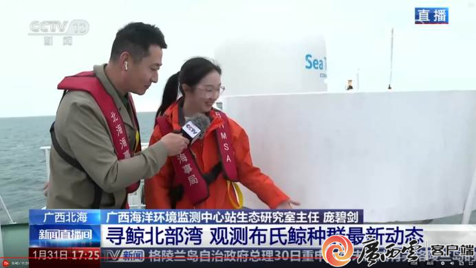 “各位观众,大家好!现在我们看到的是布氏鲸比较喜欢吃的鱼......”1月30日至2月1日,广西海洋环境监测中心站联合中央广播电视总台广西总站,组织策划了《寻鲸北部湾——北部湾布氏鲸科考直播》活动。庞碧剑在央视新闻直播间里向全国观众、网友科普了布氏鲸保护知识,直播分别在央视新媒体和央视新闻CCTV13同步直播,近2000万人观看了此次直播,充分展现了北部湾生态之美和海洋生态环境保护成效,让海洋生态保护理念深入人心。
