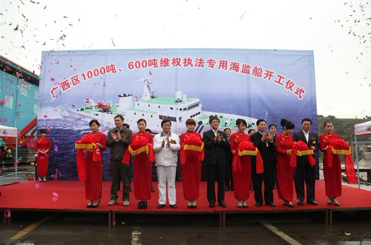 特约通讯员 黄令报道3月23日,中国海监广西区总队1000吨级维权执法专用海监船及钦州市支队、防城港市支队600吨级维权执法专用海监船开工仪式在广西梧州市中船桂江造船有限公司举行。三艘海监船共同开工建造,将促使广西海监队伍海上执法能力迎来质的飞跃,有利于广西海监队伍切实履行广西北部湾海域维权执法的行政管理职能,实现北部湾海域维权和维稳兼顾的执法使命。