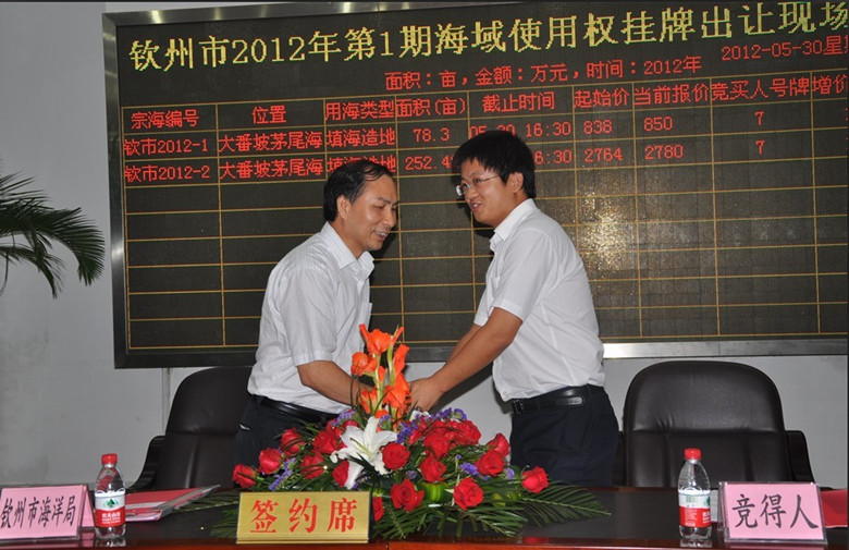 2012年5月30日,广西工程建设项目海域使用权在钦州市国土交易中心首次成功挂牌出让。