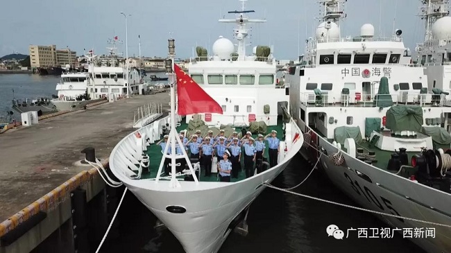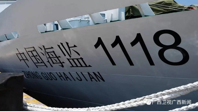 “中国海监1118”船是广西第一艘千吨级海洋行政执法专用船,它的前身是“中国海警3113”船。自2013年11月入列以来,1118船已在祖国的南海海域、广西北部湾海域航行2万多海里,执行11次国家任务,捍卫“蓝色国土”。飘扬的五星红旗,成为碧海与蓝天之间最美的“中国红”。