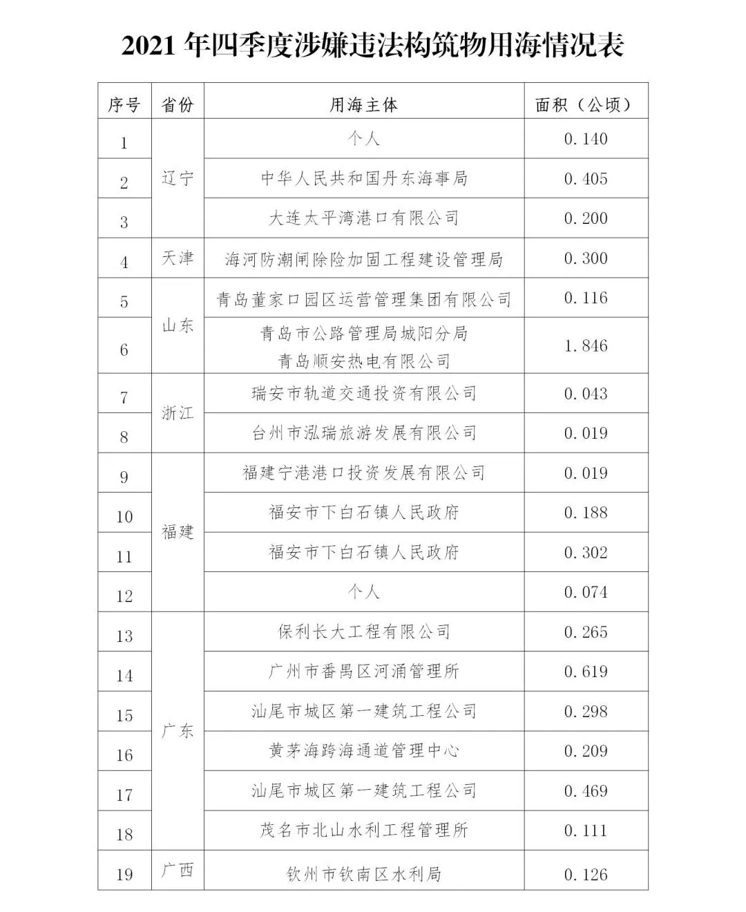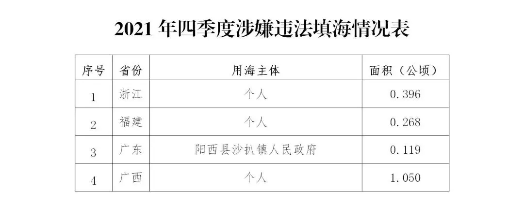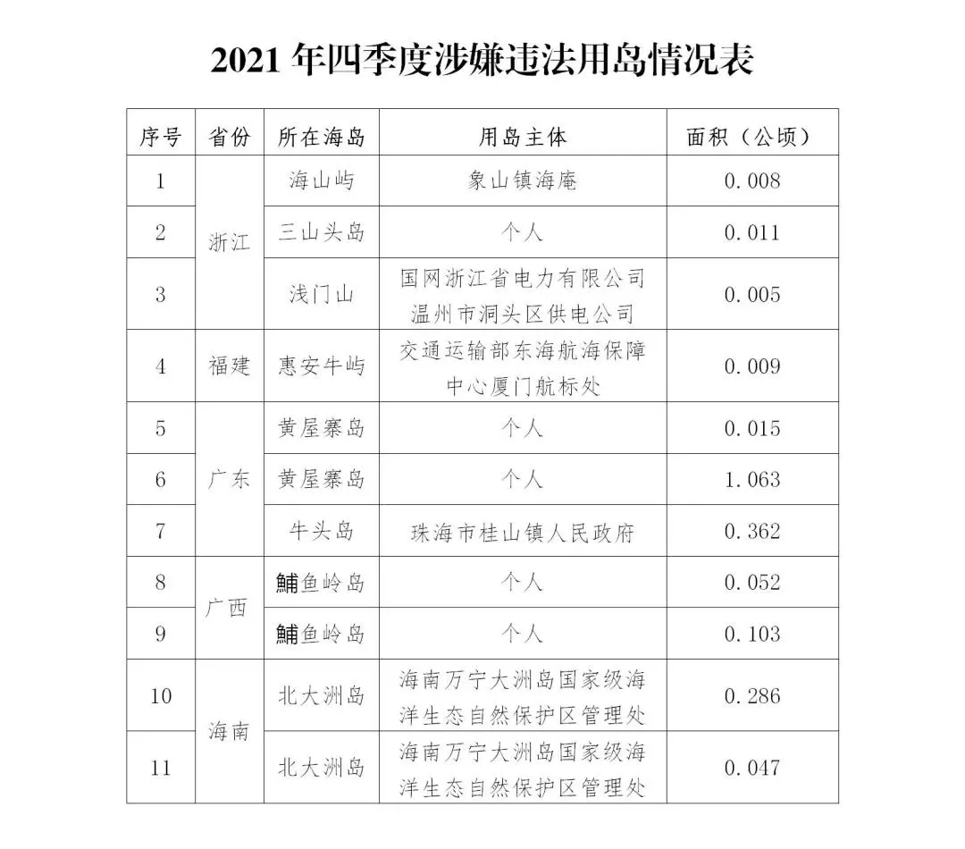 其中,第四季度发现并制止涉嫌违法填海4处,涉及海域面积约1.83公顷。其中,浙江省1处,涉及海域面积约0.39公顷;福建省1处,涉及海域面积约0.27公顷;广东省1处,涉及海域面积约0.12公顷;广西壮族自治区1处,涉及海域面积约1.05公顷。发现并制止跨海桥梁、码头、堤坝等涉嫌违法构筑物用海19处,涉及海域面积约5.75公顷。其中,辽宁省3处,涉及海域面积约0.75公顷;天津市1处,涉及海域面积约0.30公顷;山东省2处,涉及海域面积约1.96公顷;浙江省2处,涉及海域面积约0.06公顷;福建省4处,涉及海域面积约0.58公顷;广东省6处,涉及海域面积约1.97公顷;广西壮族自治区1处,涉及海域面积约0.13公顷。发现并制止涉嫌违法用岛11处,面积约1.96公顷。其中,浙江省3处,面积约0.02公顷;福建省1处,面积约0.01公顷;广东省3处,面积约1.44公顷;广西壮族自治区2处,面积约0.16公顷;海南省2处,面积约0.33公顷。(清单附后)