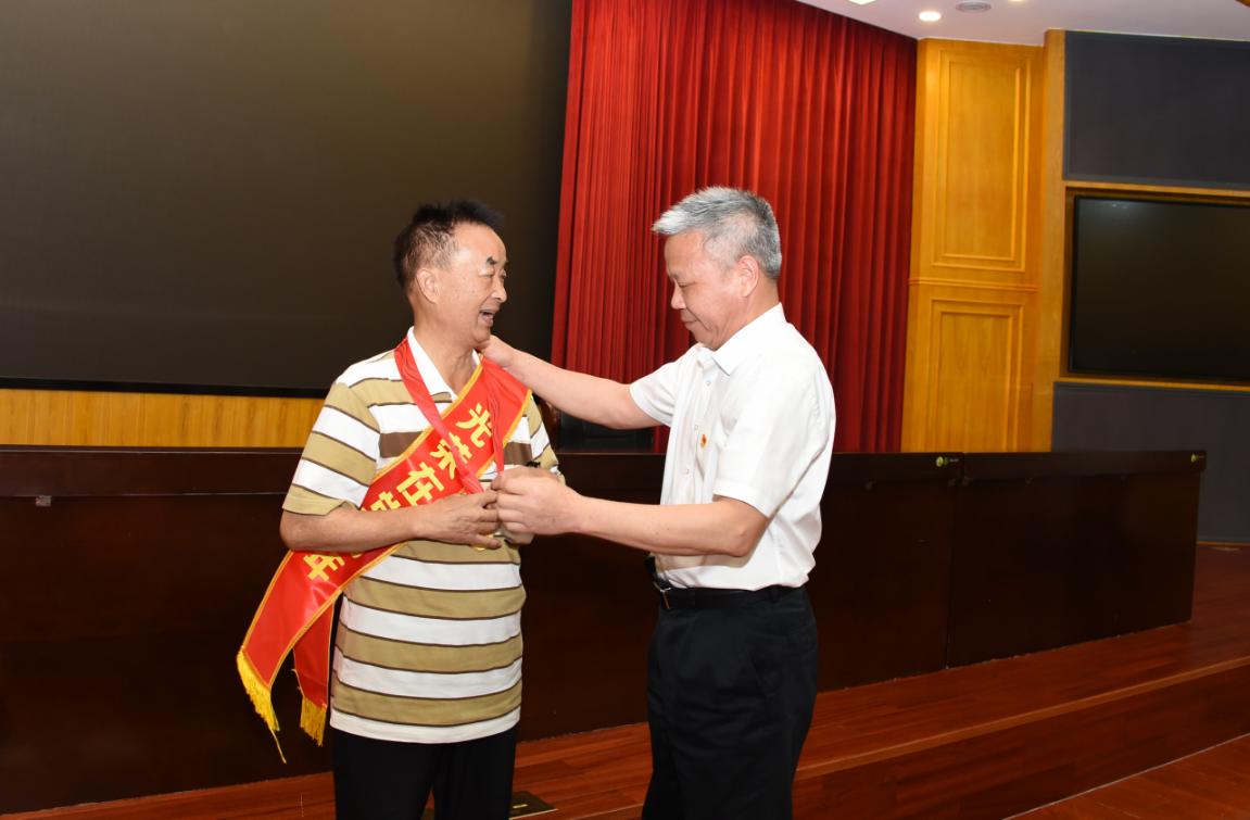 局党组书记贺志刚同志为老党员农作烈颁发“光荣在党50年”纪念章。