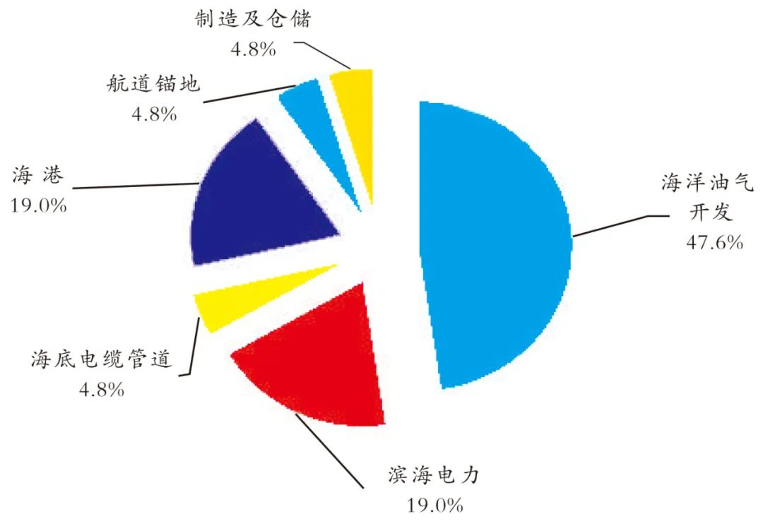 中国海洋工程年报中划分的海洋工程类型包括:海洋渔业设施、海洋化工、海底矿产资源开发、海洋油气开发、制造及仓储、滨海电力、可再生海洋能源开发、海水综合利用、海港、航道锚地、路桥隧道机场、海洋旅游设施、海底电缆管道、海洋生态保护修复以及其他。