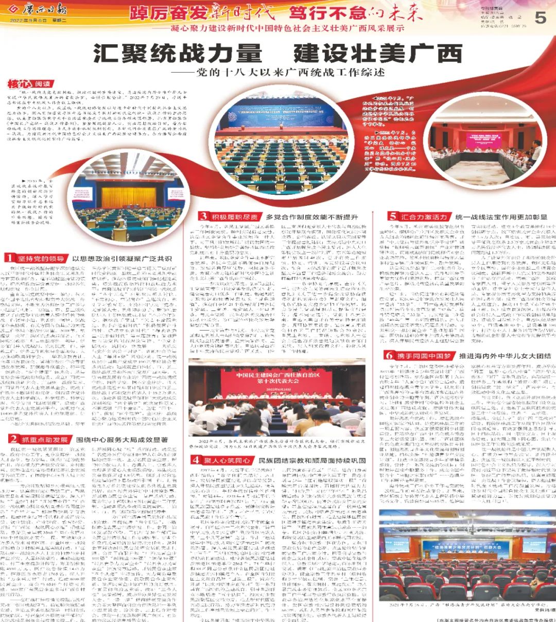 党的十八大以来,我区统一战线始终坚持以习近平新时代中国特色社会主义思想为指导,深入贯彻落实习近平总书记关于做好新时代党的统一战线工作的重要思想,认真贯彻落实党中央和自治区党委关于统战工作各项决策部署,扎实贯彻落实《中国共产党统一战线工作条例》,紧紧围绕凝聚人心,突出思想政治引领,着力推动统战工作思路理念、方式方法和体制机制创新,不断巩固和发展最广泛的爱国统一战线,为建设新时代中国特色社会主义壮美广西凝聚磅礴伟力,奋力谱写全面建设社会主义现代化国家的广西篇章。