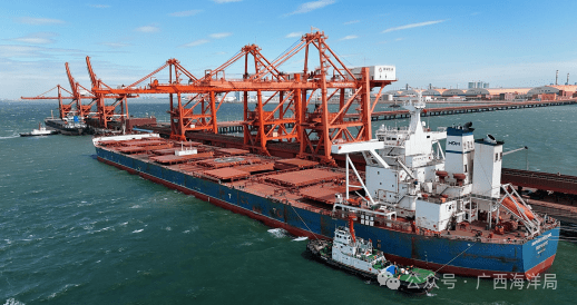 在柳钢防城港基地,满载铁矿石、钢材的轮船有序装卸,橘色的卸船机、岸桥与湛蓝的海水交相辉映,勾勒出一幅繁忙而壮美的图景。