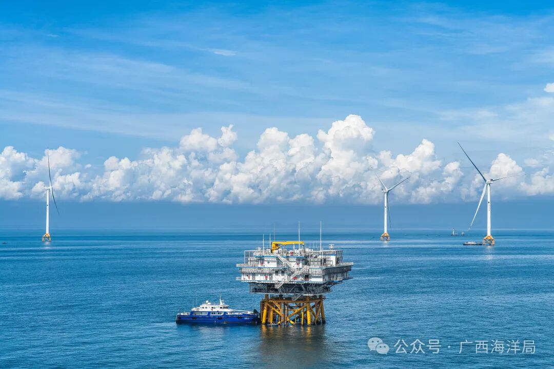 在距离防城港海岸约16公里的蔚蓝海面上,一座座百米高的白色风车巍然屹立,叶片划破长空,将海风转化为清洁电能——这是我国首个全嵌岩基础海上风电示范项目,也是广西海上风电产业从无到有的历史性突破。该项目不仅为岩基海域风电开发提供可复制的技术方案,更标志着广西海洋新兴产业迎来规模化发展的春天。