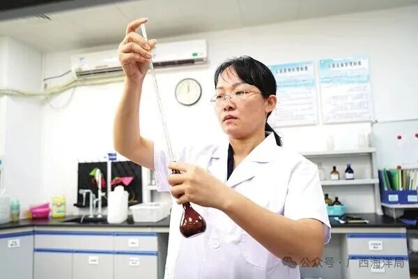 何祥英在实验室进行海水检测。 广西壮族自治区海洋局供图