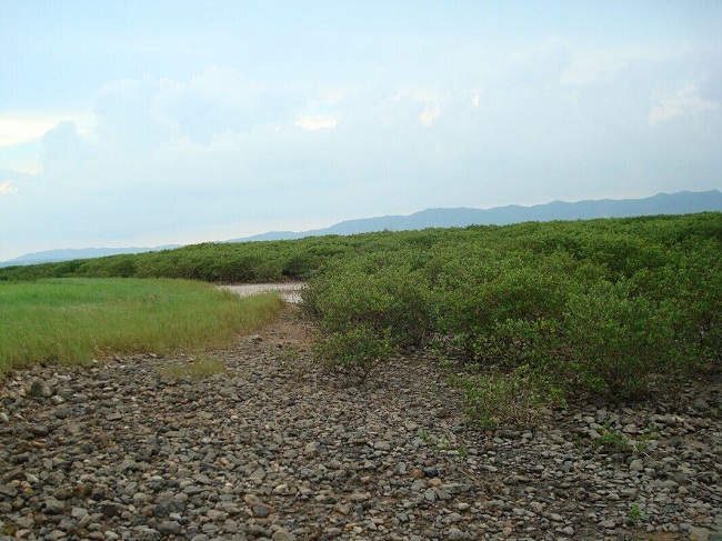 老鸦洲岛位于合浦县铁山港湾北部海域,距离大陆海岸较近,仅690米。岛上生长有草丛,乔木,灌木丛等植被。该东北部岸滩生长有红树林、草滩及沙滩;南部岸滩分布有红树林、草滩、砾石滩;西部岸滩为岩滩、砾石滩,在砾石岩滩上生长有红树林;东部海岸建有一个大型庙宇,庙宇两侧建有两座房屋,庙宇前修建有一小型广场,常住有香公居住管理庙宇。