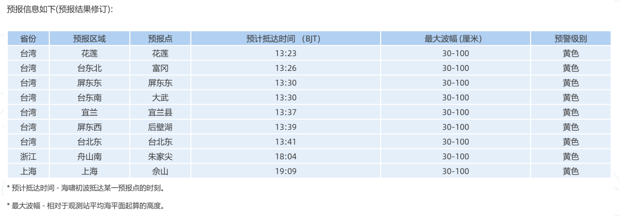 经自然资源部海啸预警中心综合分析研判,此次地震已引发越洋海啸,预计海啸波将于13:30到达台湾沿岸,17-19点左右到达浙江、上海沿岸,最大波幅分别为60、40和30厘米。目前,台风"竹节草"正在浙江省境内移动,预计将在浙江、上海等沿海地区引发100厘米左右的风暴增水。海啸与台风双重灾害影响,沿海地区务必高度警惕,做好防灾减灾工作。