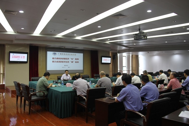 在全党上下统一开展“不忘初心、牢记使命”主题教育之际,为丰富活动形式,更扎实、有效地开展主题教育,围绕习近平总书记在广西视察时强调 “打造好向海经济”的要求。7月23日下午,自治区海洋局局长蒋和生为全体干部上《奋力推进向海经济“壮”起来,努力实现海洋生态“美”起来》专题课。局机关及直属单位党员干部职工60余人参加活动。