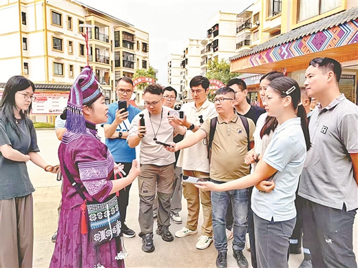 在隆林各族自治县鹤城新区易地扶贫搬迁安置点,县政协委员、县直机关幼儿园园长苏彩云(左二)向媒体记者讲述他们促进民族团结的履职实践。 (自治区政协供图)